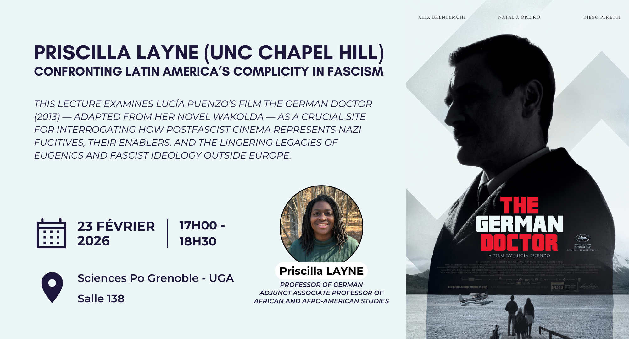 On February 23, from 5:00 p.m. to 6:30 p.m., at Sciences Po Grenoble – UGA (room 138), Priscilla Layne (UNC Chapel Hill) will give a lecture entitled "Confronting Latin America's Complicity in Fascism, " which will offer an analysis of the Lucía Puenzo's film The German Doctor (2013) by Lucía Puenzo in order to examine the representation of Nazi fugitives, their supporters, and the lingering legacies of eugenics and fascist ideology outside of Europe.